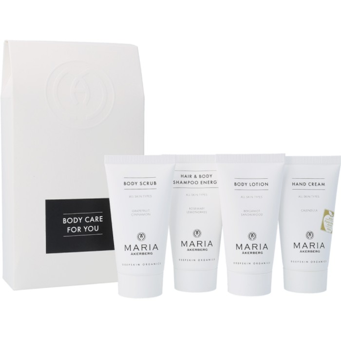 Body Care For You från Maria Åkerberg är en presentask med produkter som passar de flesta, och som rengör både kropp och hår, exfolierar och återfuktar. Ett passande kit att ge som en present till någon som vill testa produkter från Maria Åkerberg, eller att köpa till sig själv som reseförpackningar. Asken innehåller en hår- och kroppstvål, en kroppspeeling, en hudlotion  och en handkräm i små förpackningar á 30 ml.